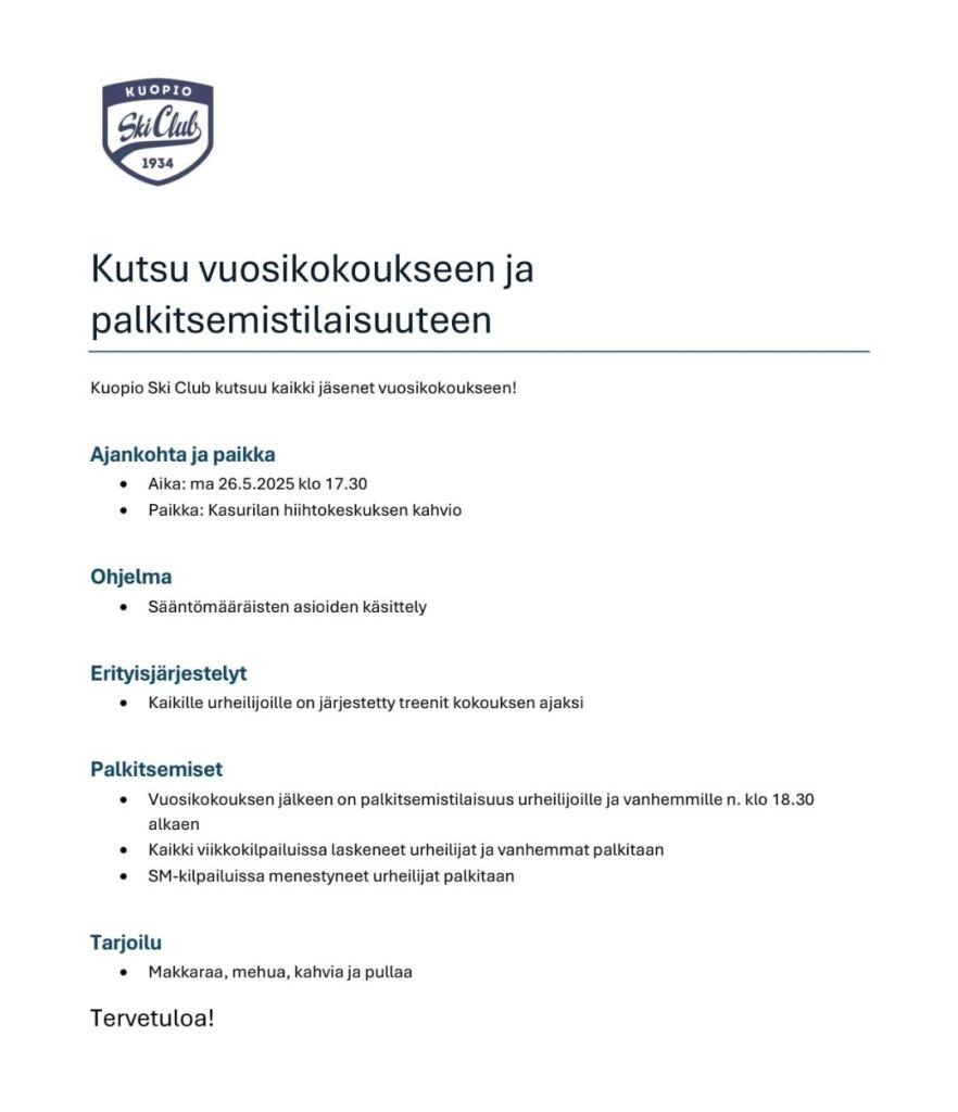 Tervetuloa kaikki KSC:n jäsenet seuran sääntömääräiseen vuosikokoukseen Kasurilan kahvioon ma 26.5 klo 17.30 alkaen. Kokouksen päätteeksi palkitaan kaudella 24-25 menestyneitä urheilijoita (mm.kaikki viikkokisoihin osallistuneet urheilijat sekä SM-mitalistit. )