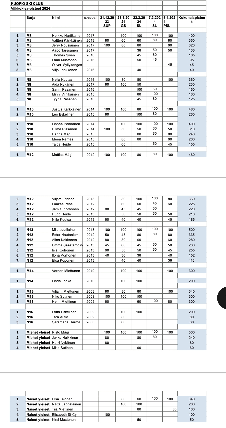 Kuopio Ski Clubin viikkokisat ovat perinteinen seuran sisäisen kilpailu, jotka eivät maksa jäsenille mitään. Mukaan ovat tervetulleita kaikki juniorit ja aikuiset.